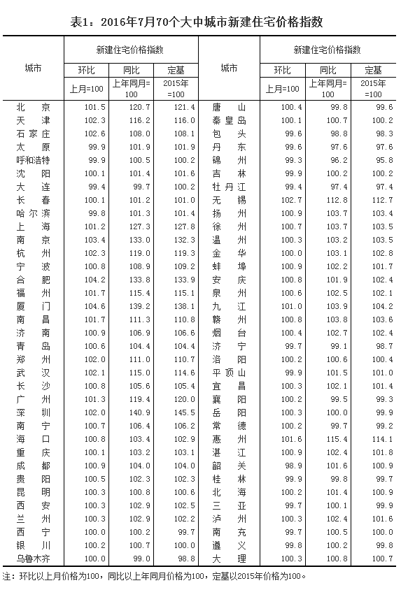 2016年7月份70個大中城市住宅銷售價格變動情況