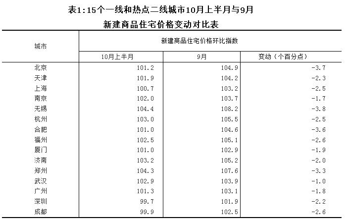 注1:為快速反映近期房地產(chǎn)市場的變化,國家統(tǒng)計(jì)局在做好9月份70個(gè)大中城市房價(jià)統(tǒng)計(jì)的同時(shí),對(duì)其中一線和部分熱點(diǎn)二線城市10月上半月的房地產(chǎn)市場情況進(jìn)行了統(tǒng)計(jì)。