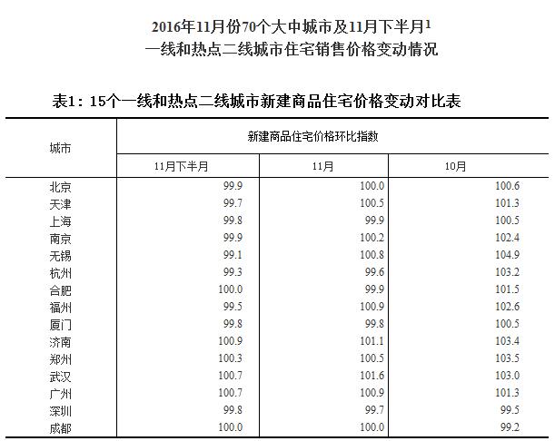 注:1、為深入反映房地產(chǎn)市場(chǎng)近期變化,國(guó)家統(tǒng)計(jì)局在做好11月份70個(gè)大中城市房?jī)r(jià)統(tǒng)計(jì)的同時(shí),又對(duì)其中15個(gè)一線(xiàn)和熱點(diǎn)二線(xiàn)城市11月下半月房?jī)r(jià)與11月上半月比較的變動(dòng)情況進(jìn)行了統(tǒng)計(jì)