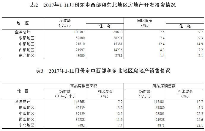 1-11月份,東部地區(qū)房地產開發(fā)投資52880億元,同比增長7.4%,增速比1-10月份回落0.6個百分點;中部地區(qū)投資21610億元,增長12.4%,增速回落0.7個百分點;西部地區(qū)投資21997億元,增長4.3%,增速提高0.2個百分點;東北地區(qū)投資3900億元,增長1.4%,1-10月份為下降0.4%。