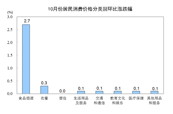 10月份,全國(guó)居民消費(fèi)價(jià)格環(huán)比上漲0.9%。其中,城市上漲0.8%,農(nóng)村上漲1.2%;食品價(jià)格上漲3.6%,非食品價(jià)格上漲0.2%;消費(fèi)品價(jià)格上漲1.4%,服務(wù)價(jià)格持平。
