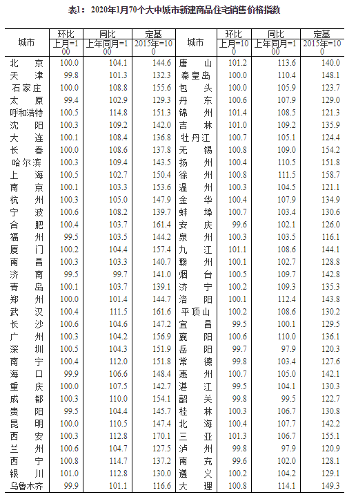 2020年1月份70個大中城市商品住宅銷售價格變動情況